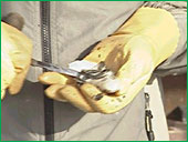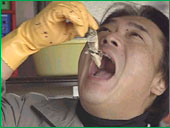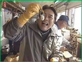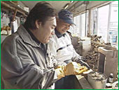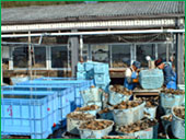 カキガラに付いた余計な物を取り除き、 いよいよカキむき場に運ばれます。 居ます居ます、物凄い人達! 皆さん黙々と作業をしています。 カキむき名人ともなれば、1日60Kgの カキをむきます。 大きなかごを5〜6箱!