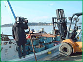 カキ剥き場にやってまいりました。 東名(とうな)漁港。 漁船がカキ棚から水揚げしたばかりのカキを 陸揚げしていました。 東名で水揚げされるカキは 実が大きいのが自慢!