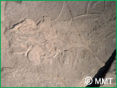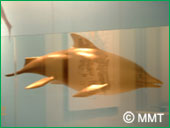 魚類の化石としては、世界最古の ものとも言われています。 再現された姿はイルカのようです! イルカとのはっきりした違いは、 後ろのヒレが後に足へと変わっていった 進化の過程を想像させてくれます。