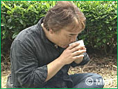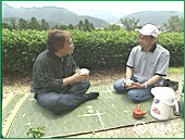 茶畑で煎茶の「野だて」と洒落ましょう! 人でも植物でもこんなに美しい景色を 眺めていれば、良い味が出るはず! 桃生のお茶の特徴は、「色が濃く お茶の味が濃い」!ということです。 まさに、お茶の葉っぱの色です! 夏ならでわ!のお茶の入れ方・楽しみ方を教えて頂きました! 急須にお茶の葉と氷を入れ、ゆっくりと氷が解けて自然に出てくる お茶! 「うわ〜!驚き!」色は濃く出ているのに、苦くなどありません!甘いのです! お茶の甘さを感じたいなら、この入れ方が最高かもしれません!一度 お試しあれ!