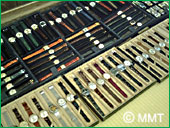 中でも人気なのが、 お客さんのご要望に応じてデザインする、 オリジナルのアクセサリーです。 そして、店の奥に珍しい物を発見しました! ご商売の傍らに集めたという、 機械時計のコレクション! そして、修理用の珍しい工具も沢山あります。 この装置は、機械時計の誤差を 測定する「遅速検定器」! 全国でも2台しか無いという珍しい物です。 珍しい、時計をひとつチョイスして頂きました! 目覚ましのベルが鳴る機械時計! セミの鳴き声のようでしたよ! |
