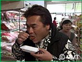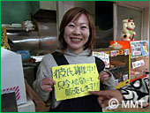 そして、もうひとつのお勧めは 「彼氏 募集中!只今 格安にて販売します!」 の桃子さん(ヤマトクのお嬢さんです)。 そんな、桃子さん一押しの一品は? 創業以来変わらぬ味の「メンチカツ〜〜〜」!