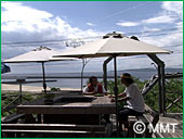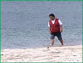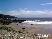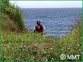 裏の海岸で、面白い釣りをしているというので、桶谷さんの軽自動車で GO!着いた所は山の中腹。10分ほど山道を下ると そこには・・・!ブルーマリーン!「いしど浜」!何と美しい海岸でしょう!浜には、「はまゆう」の花が咲き、これは珍しい「アオスジアゲハ」が乱舞しています。