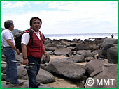 遠くに 釣り人発見!この漁場の監視員をしている吉田さんです。何だ〜!この竿?この仕掛け?この地域で昔から行われている漁法「アナゴヌキ」といいます。長い竹竿に短い糸。その先には 針と餌だけ!潮の引いた岩の穴に、この仕掛けを突き刺します。あ〜ら不思議!面白いように釣れます!アブラコ・ソイ などなど。