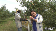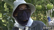 作業の方々は完全防備?顔が見えない・・・この時期はリンゴに陽を当てる為
