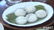 笹を敷いお皿に水を張って「おまんじゅう」を並べます・・・