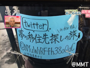 背中に「夢の移住先探しの旅」と書かれたプラカードをバッグに貼っています。。。