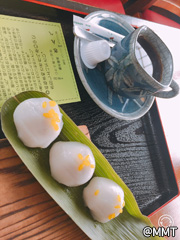 笹の葉の上に白いお団子が3個・・・上に黄色いお米が載っています・・・