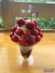 サクランボ狩りを楽しんだ後は店舗の2階にある喫茶ルームで! 「サクランボパフェ」をいただきました。。。 これでもか・・・というほど旬のサクランボがのっています。