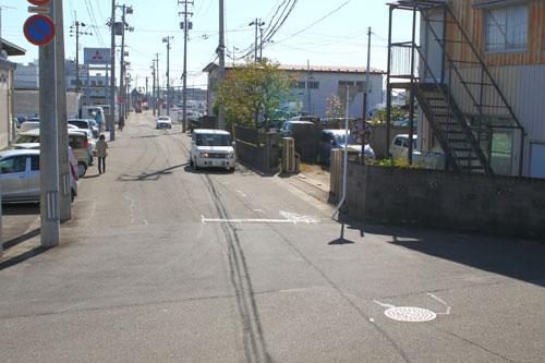スロープを降りたら左へ。 降りる途中に見えるT字路を奥に向かって進みます(南進)。 歩道がありませんので、車にご注意ください。