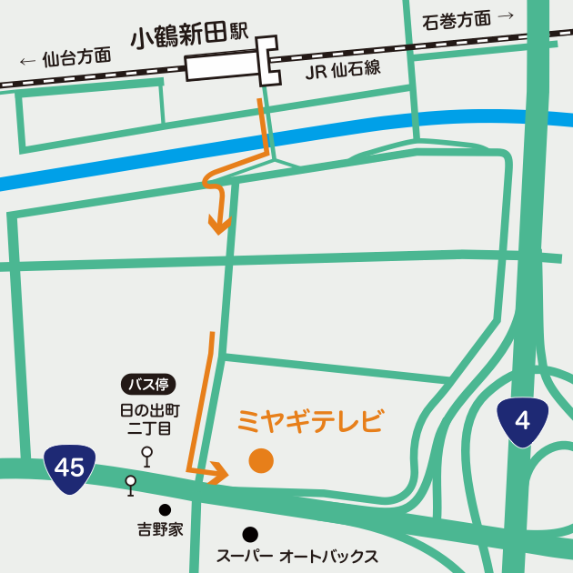 JR仙台駅から約10分「小鶴新田駅」で下車。改札を出て右、日の出町方面(南)へ。