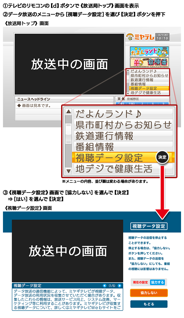 停止する場合は、下図の通り、ミヤギテレビのデータ放送の《放送局トップ(ニュース・天気)》画面を表示し、[視聴データ設定]画面で[協力しない]ボタンを押してから[はい]を押してください。再度ご協力いただける場合には、[協力する]ボタンを押してから[はい]を押してください。