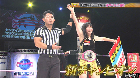 愛海「本当にうれしいです!!念願のベルトなので。重みがすごくてうれしさがMAXです。