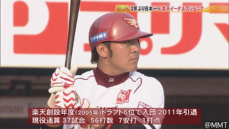 楽天創設年度、最初のドラフトで楽天入り。強肩強打の選手でしたがケガもあって思うような成績が残せず2011年に引退。その後イーグルスのジュニアコーチとして子どもたちに野球指導を行っています。