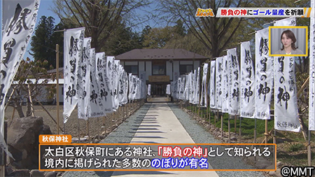 ここには「勝負の神」がまつられていて、境内には願いが込められた、沢山の「のぼり」が立っています。
