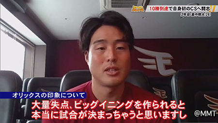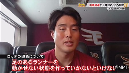 瀧中投手「(今シーズンの)最初の1勝目、西武戦ですね。ロッテ戦で打たれた後の西武戦は、ここでもうダメなら今年もうないかなとも思っていたので。本当にあそこでしっかり投げ切れたっていうのは振り返ってみるとすごく大きかったかなと思います」