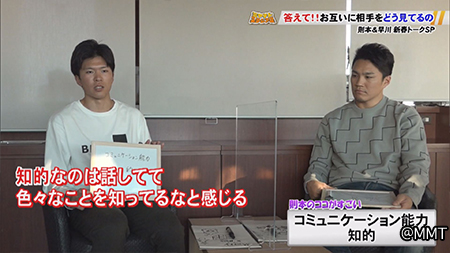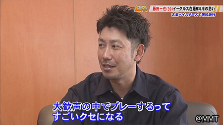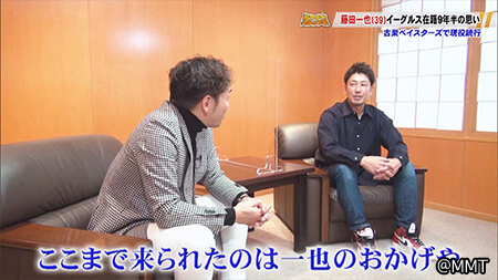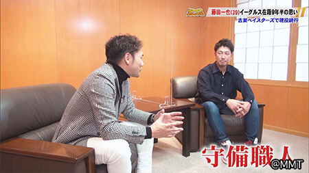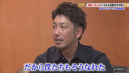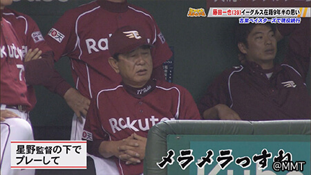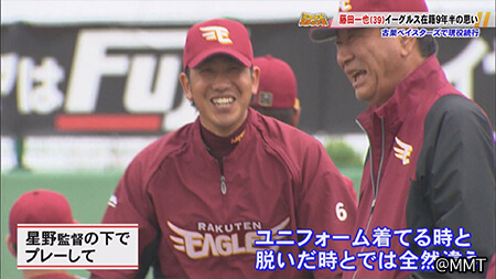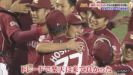 藤田選手 「楽天にトレードになった時に一番初めに思ったのが、星野監督やったんですよね。すごい怖いイメージだったし僕みたいなん、大丈夫かなっていう。ユニフォーム着てる時と、脱いだ時とでは全然違う、メラメラっすね。だから僕たちもそうなれた」