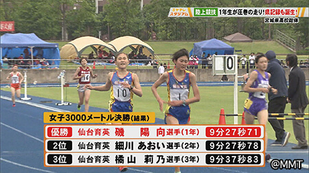 まずは女子3000メートル、今年の全国都道府県対抗女子駅伝で1区を走った仙台育英の細川あおい選手と激しいトップ争いの末、同じく仙台育英の磯陽向選手が優勝をかざりました。