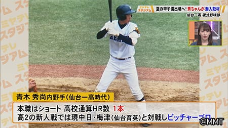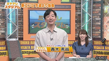 秀ちゃん 「ミヤギテレビ入社5年目の青木秀尚です。大学まで12年間野球をやっていました。スポーツがとても大好きです。プロアマ問わず、たくさんの選手の声を伝えることで宮城のスポーツを盛り上げたいと思っています。これからよろしくお願い致します。」