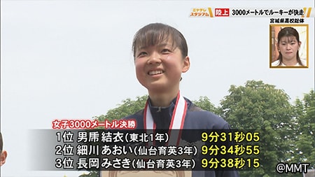 陸上競技、女子3000メートル決勝では、東北高校1年生男乕結衣が見事な優勝を飾りました。