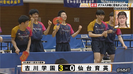 卓球、男子学校対抗決勝戦では、古川学園が3対0で仙台育英を下し、3連覇を達成。