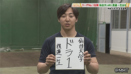 渡邉一生投手 「目標は高く持ちたいので、今年のドラフトで1位指名されるような選手になりたいと思っているのでドラ1って書かせていただきました」