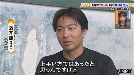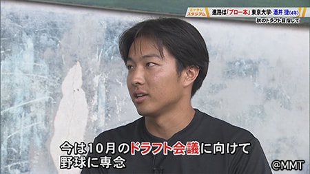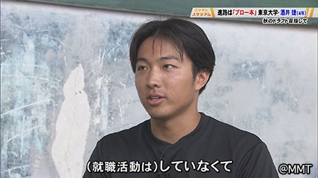 酒井捷選手 「実力的にはまったくプロというレベルには達していなくて、幸いいろんな方に注目していただけたり、東大生っていうことで少し実力に下駄を履かせてもらっている部分もあって、そういった面で行くと本当に結果さえ出せればプロに行く可能性はあると思っているので、なんとかどこかに指名いただけたらなと思っています」